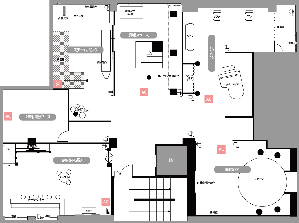 ゴシック・廃墟・儀式の間など合計6ブース、非日常空間がたくさん!